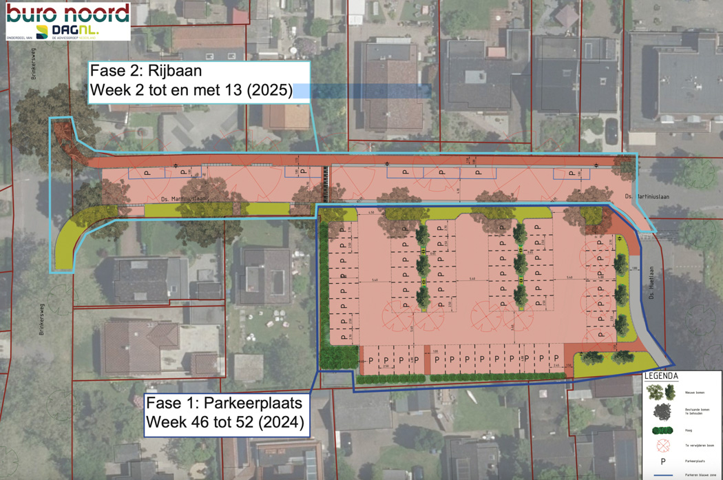 De parkeerplaats aan de Ds. Martiniuslaan is inmiddels weer deels geopend. Parkeren is mogelijk via een tijdelijke ingang vanaf de Ds. Huetlaan.