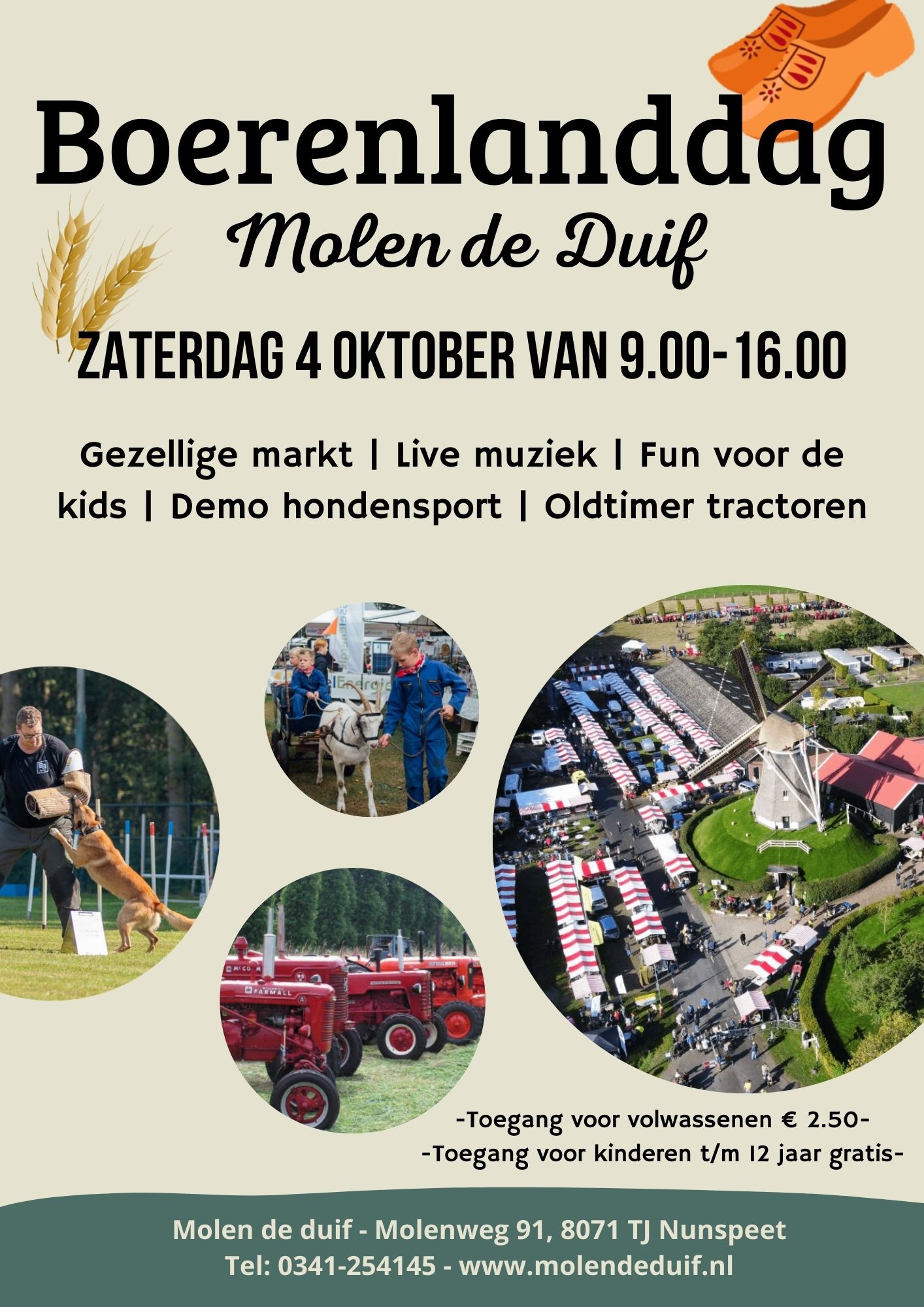 NUNSPEET– Op zaterdag 4 oktober wordt bij Molen de Duif in Nunspeet weer de jaarlijkse Boerenlanddag gehouden. Het belooft een gezellige dag te worden met activiteiten voor jong en oud.