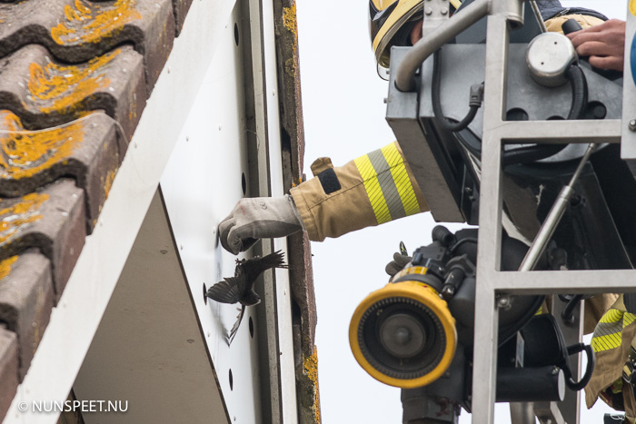 NUNSPEET – De brandweer heeft vanmorgen een zwaluw bevrijd die verstrikt zat in vliegertouw aan een nestkast bij een woning aan de Gerbrandystraat.
