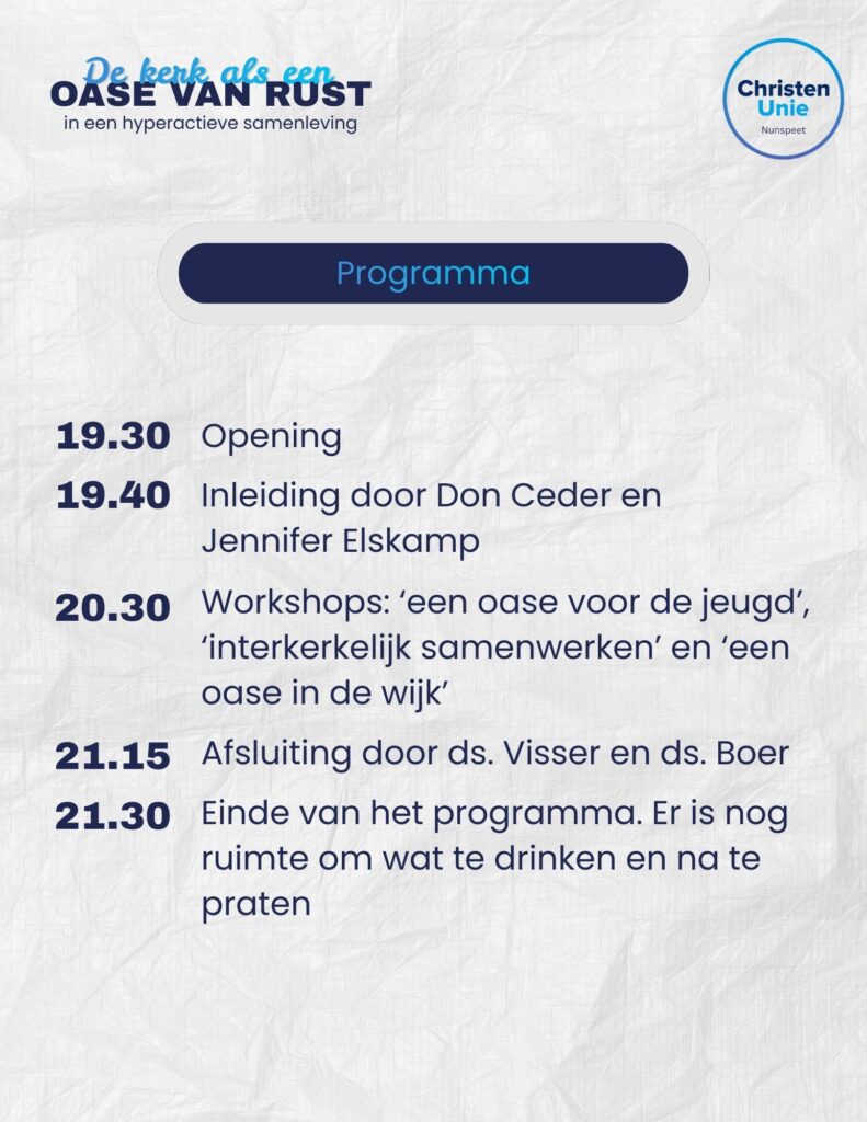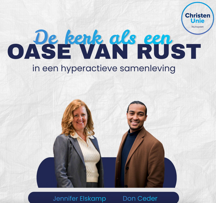 Op maandag 19 januari organiseert de ChristenUnie een avond voor de kerken. Het thema is: de kerk als oase van rust in een hyperactieve samenleving. Er zal een plenair programma zijn waaraan Don Ceder, tweede kamerlid voor de ChristenUnie en Jennifer Elskamp, wethouder in Nunspeet, een bijdrage zullen leveren. Daarna zullen er verschillende workshops gegeven worden. Het doel is dat mensen die betrokken zijn bij de verschillende kerken in de gemeente Nunspeet elkaar inspireren en meer met elkaar gaan samenwerken.