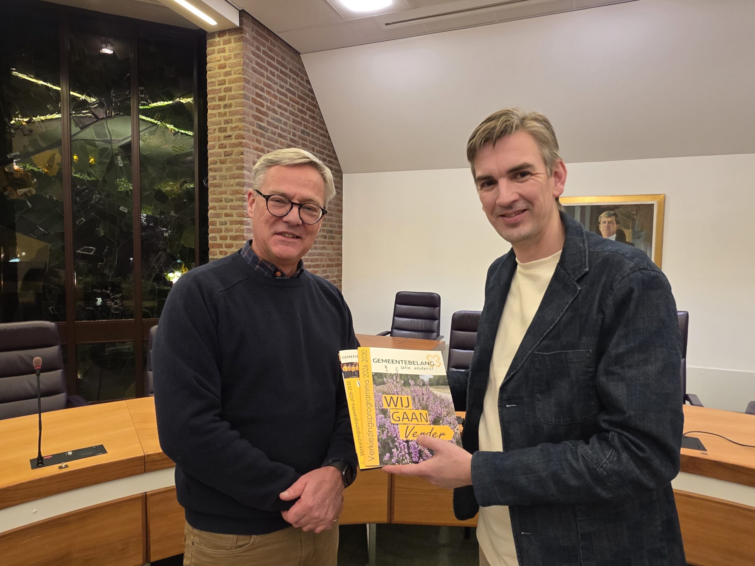 Lijsttrekker Pieter-Jan van Rossen mocht het programma in ontvangst nemen van bestuursvoorzitter Klaas-Jan Kok. Van Rossen: “Met de titel Wij Gaan Verder willen we niet alleen aangeven dat we verder gaan met de ingeslagen koers, maar ook dat we daarmee nét wat verder gaan dan de rest. We hebben in de afgelopen jaren veel kunnen realiseren en kunnen inzetten, zoals de stationsomgeving, sportpark de Wiltsangh en ambitieuze woningbouwplannen die Nunspeet écht nodig heeft. Maar ook beleid voor sport, cultuur, jeugd en inclusie. We hebben goede ideeën om daar verder mee te gaan.”