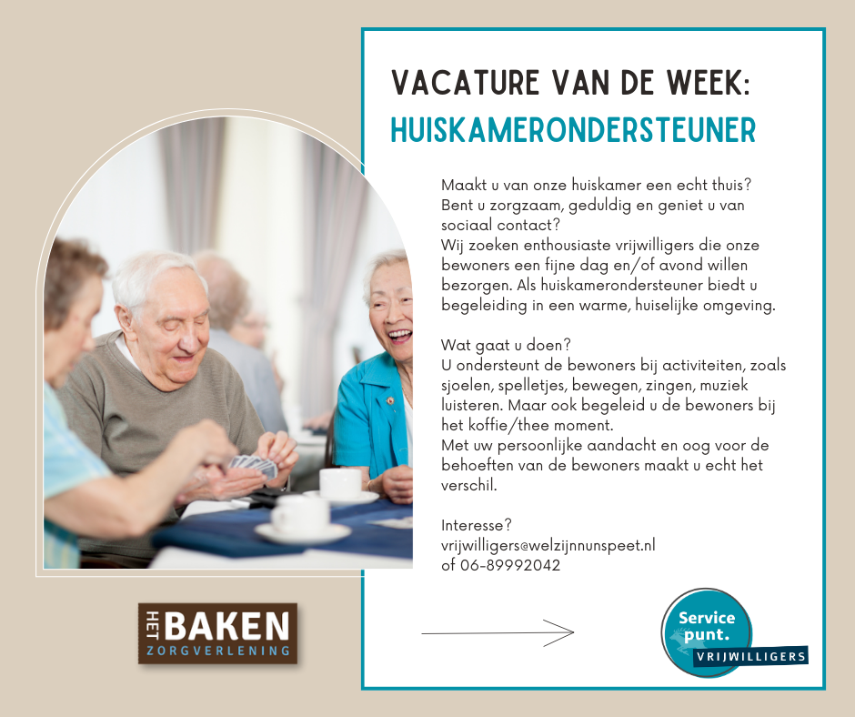 “Onze huiskamer is een plek waar bewoners zich thuis mogen voelen,” aldus Het Baken Zorgverlening. “Vrijwilligers spelen hierin een onmisbare rol. Zij zorgen voor gezelligheid, structuur en waardevol contact.”