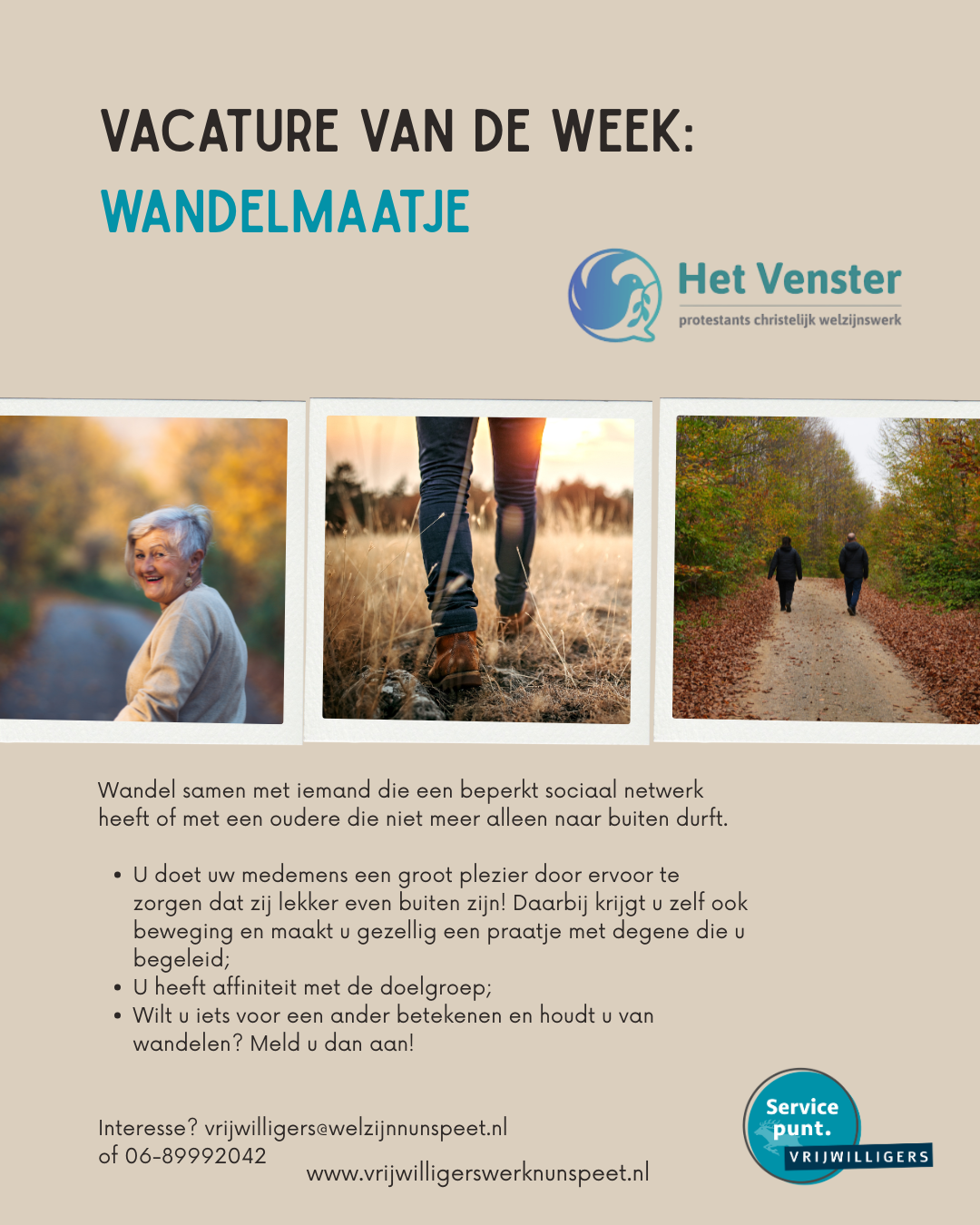 NUNSPEET– Stichting Het Venster – protestants christelijk welzijnswerk is op zoek naar betrokken vrijwilligers die als wandelmaatje het verschil willen maken voor inwoners van de gemeente Nunspeet. Met de vacature van de week vraagt de organisatie aandacht voor mensen met een beperkt sociaal netwerk of ouderen die niet meer zelfstandig naar buiten durven.