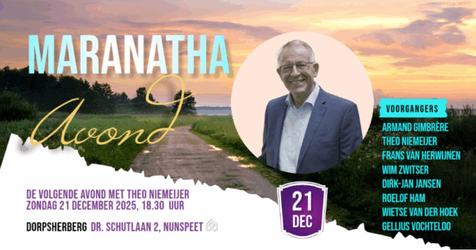 NUNSPEET – Aanstaande zondag 21 december 2025 is de laatste Maranatha-avond van dit jaar met spreker Theo Niemeijer, bekend van Het Zoeklicht. De studies zijn elke 2 weken in de DorpsHerberg aan de Ds. Schutlaan 2 te Nunspeet.