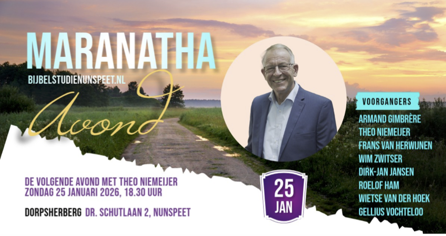 NUNSPEET – Aanstaande zondag 25 januari 2026 is er weer een Maranatha-avond in Nunspeet met spreker Theo Niemeijer bekend van o.a. Het Zoeklicht en Family7.