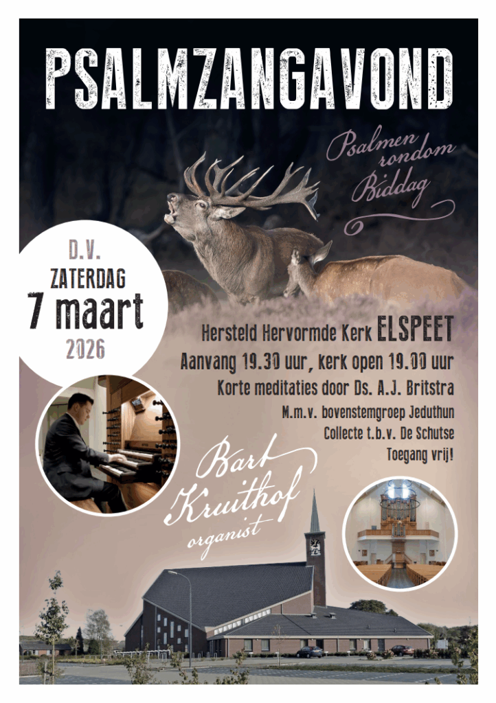Het thema van deze avond is: Psalmen rondom Biddag. Tijdens deze avond zal Ds. A.J. Britstra een aantal korte meditaties houden. Het Metzler-orgel wordt bespeeld door Bart Kruithof. Medewerking wordt ook verleend door bovenstemgroep Jeduthun uit Nunspeet. De collecte is bestemd voor het werk van de Schutse.