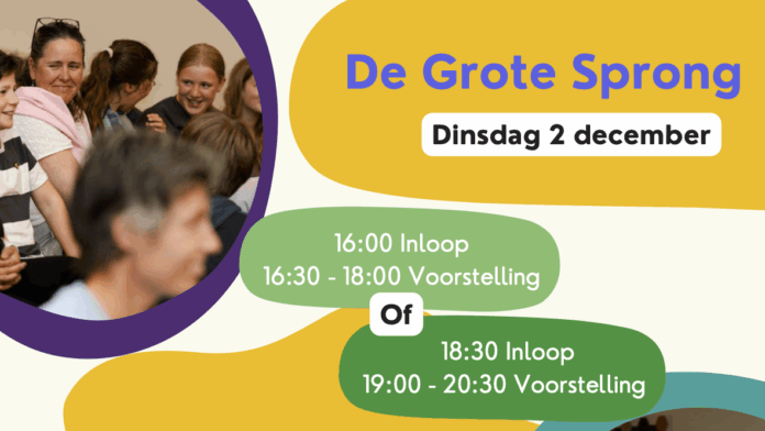 NUNSPEET – In de Veluvine wordt op dinsdag 2 december de theatervoorstelling de Grote Sprong georganiseerd. De voorstelling is speciaal voor ouders en kinderen van groep 8 of de brugklas en gaat over de veranderingen als je naar de middelbare school gaat. Er zijn twee voorstellingen: om 16:30 uur en om 19:00 uur. De entree is gratis. De avond wordt georganiseerd vanuit een samenwerking tussen de welzijnspartijen in Nunspeet en de gemeente Nunspeet.