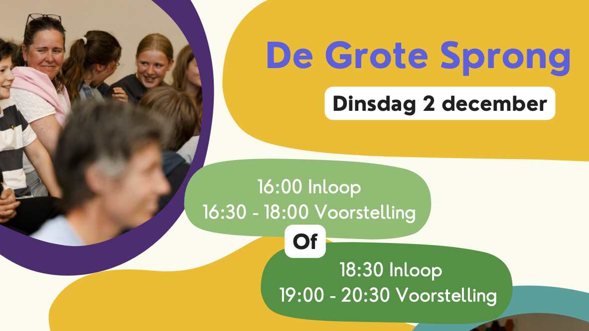 De ervaren acteurs en gespreksleiders Lis de Kort en Bas Klemann schetsen op een scherpzinnige en humoristische manier wat er allemaal gebeurt als je naar de middelbare school gaat. Wat de rol is van thuis, familie en vrienden en hoe je met elkaar in contact blijft als alles om je heen verandert. De Grote Sprong helpt je om vol zelfvertrouwen naar de brugklas te gaan en jezelf te blijven. Aanmelden voor de voorstellingen kan via https://welzijnnunspeet.nl/project/de-grote-sprong/.