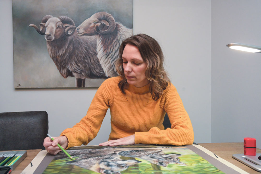 Ik hou van dieren en vind ze heel puur en mooi qua vacht en hun uitdrukking. Ik ben les gaan nemen in Elburg bij Gerard ter Horst en maakte daar deel uit van een leuke groep. Ik heb dat zo’n tien jaar gedaan. Ook heb ik nog en poosje les gehad van Piet Bruins, in Nunspeet geen onbekende.Toch bleef ik altijd op zoek. Met verf en vooral olieverf kon ik naar mijn idee niet goed overbrengen wat ik wilde. Toen kwam de coronacrisis en kwamen de lessen te vervallen en ben ik thuis met potloden gaan werken en dat gaf mij zoveel voldoening dat ik er niet meer mee ben gestopt. Na enige tijd miste ik wel de groep en ben teruggegaan naar Elburg en nam mijn verfspullen weer mee. Al gauw ontdekte ik dat ik dit niet meer moest doen, ik ben een echt potlood mens. Ik blijf naar de lessen gaan al kan Gerard ter Horst. Hij kan mij niet helpen met de techniek, maar wel met lichtval, de compositie, kleur en opbouw”. Dan toont ze een aantal werken van schapen en wolven zo ontzettend mooi dat het nauwelijks is te geloven dat het met potlood en krijt is vervaardigd. Ware kunstwerken, die inmiddels ook gretig aftrek vinden via internet. Ineke:,,Met potlood kun je veel gedetailleerder werken dan met verf. Daar komt bij dat ik met verf weinig geduld heb. Met potlood kun je constant blijven werken en hoef je niet te wachten tot het droog is”. Haar kunstwerk is niet onopgemerkt gebleven want met regelmaat worden haar werken via internet verkocht.
